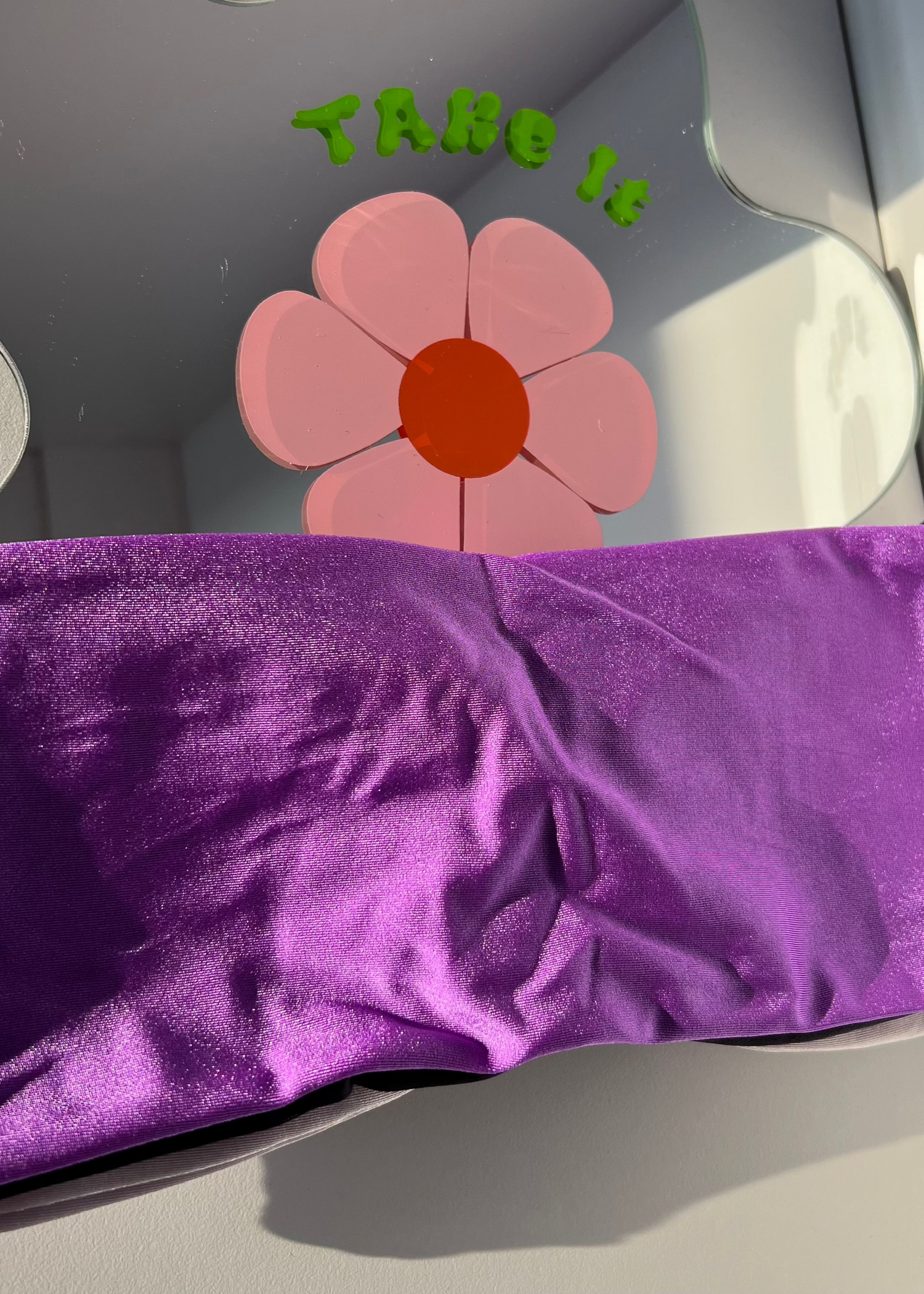 Top de bikini bandeau con tejido brillante en tres tonos diferentes de lila y detalle de nudo en la parte delantera. Es clásico y encantador.